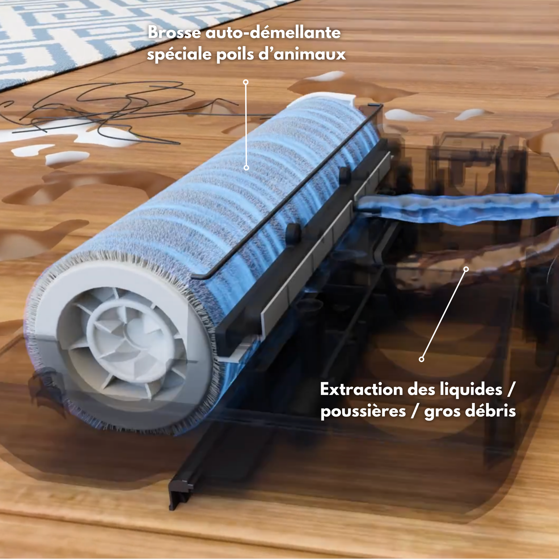 Avec sa brosse motorisée effectuant plus de 1100 tr/mn et son moteur d'aspiration brushless, l'aspirateur laveur V3clean aspire avec facilité les liquides, gros débris, cheveux et poils d'animaux.